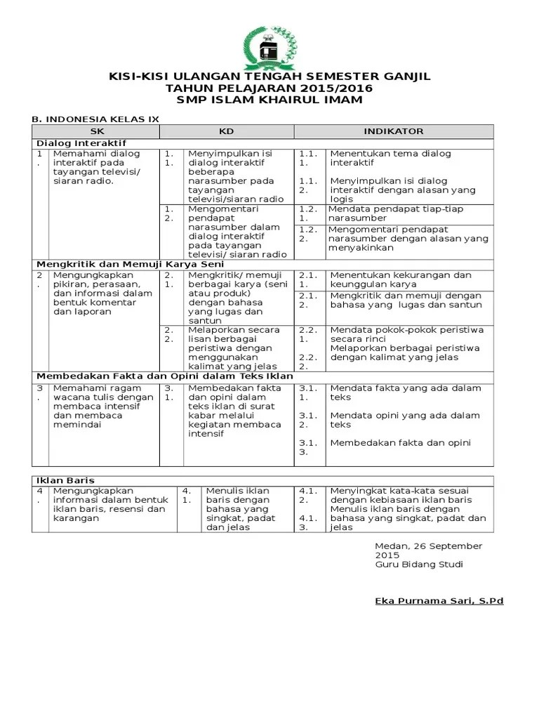 Latihan soal mandiri ulangan akhir semester ganjil tahun pelajaran 2016/2017 alamat . Latihan soal uas bahasa indonesia kelas 9 semester ganjil. Hai adik adik dimana saja berada. Soal latihan uas kali ini sebanyak 50 . Pada kali ini kakak ingin berbagi beberapa contoh soal uas untuk mata pelajaran bahasa indonesia kelas 9 smp/mts.